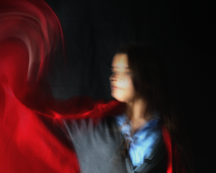 To edit these images, I firstly made it 'Black and White'. Afterwards, I selected the 'Spot Healing Brush Tool' to edit out the framing of the wall so that the main focal point would be on the the model and the motion. Next, I increased contrast and brightness so that the overall image was more visible ,and so that there would be a larger juxtaposition between the black fabric and the white wall. To make the motion more dark I went over it by using the 'burn tool' to darken it and make it stand out more to the viewer. Thereafter, I used the 'Rectangle Maquee Tool' to copy and paste the image on top of itself; I then selected the blending option 'Soft Light' as it did not harshly mirror the image, but it was more of a 'soft' method of mirroring the image. This fit in with my project as it contains all the elements from each artist I researched: Francesca Woodman and black and white; Paolo Roversi and the use of fabric; Bill Wadman and the concept of capturing motion; Heather Hansen and the idea of kinetic drawings. One aspect I enjoyed is the harshness of the movement as it stands out a lot but not too much that it overshadows the model. To improve upon my work I could possibly try making the double exposure layer a bit more harsh and I felt that it is a bit too soft.